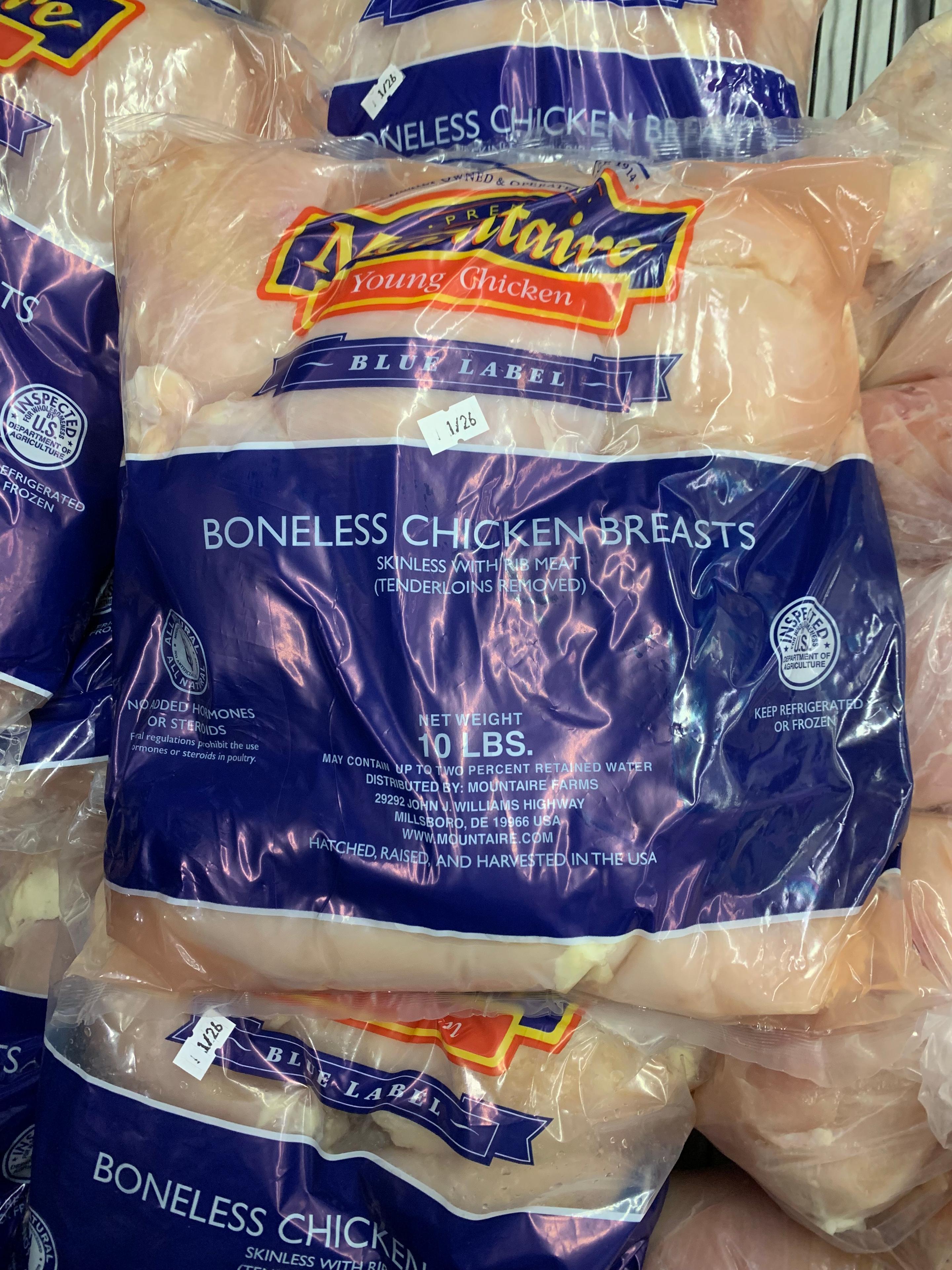 Boneless chicken breast is on sale, available in 5-pound and 10-pound bags at $1.99 per pound.